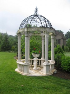 We went container shopping and found a pedestal container for the gazebo that we planted with red geraniums.