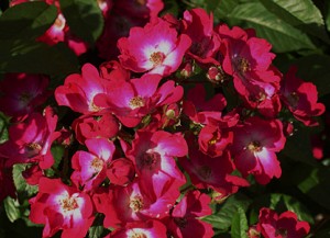 ‘Olive’, growing on the arbor leading into the Formal Garden, is a mass of bloom this week. The large , velvety, bright red flowers are borne in loose clusters. They aren’t fragrant but make long lasting additions to flower arrangements