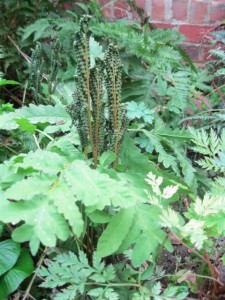The interrupted fern is pushing up its spore-bearing structures. We collected it from our farm in New Jersey and it has thrived here to the extent that I am digging it out and moving it to more challenging garden beds.