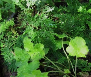 I rescued this little guy from the shade a large vine growing behind it. He is salaginella, a primtive plant I found in Home Depot in Atlanta. It is considered a fern ally and produces spores but no flowers or seeds. He grows happily now with heuchera ‘Key Lime Pie’.