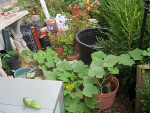 The next picture looks like a mistake; it is a picture of a corner of the area where I pot up plants, take cuttings, and plant seeds. Last spring I was sorting through my seeds packs and apparently dropped some cucumber seeds. I have watched them slowly growing, sure that they would never produce fruit because the area is so shady.
