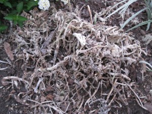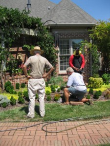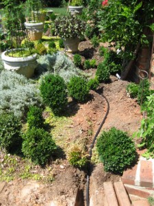 The irrigation project involved two different issues; supplying water to some new garden areas, and providing water to the permanent pots in the boxwood parterres. In the past we have watered the pots by hand but when we went away for more than a couple of days had to set up a temporary irrigation system that was unsightly and labor intensive. The new system involved carefully digging trenches through the boxwood parterres trying not to disturb the surface roots of the boxwoods.