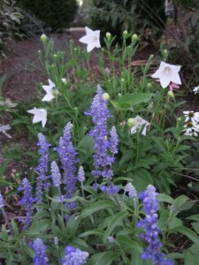 This lone plant of white balloon flower is finally blooming and looking good with blue salvia ‘Victoria’. I cut it back a couple of times because balloonflower tends to get too tall and floppy in my garden. The result was good and the plant is just the perfect size for the mid-border.