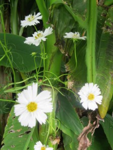 Hidden beneath the leaves of the banana tree small cluster of white cosmos bloomed.