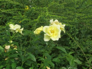 Less floriferous, the yellow patio rose in the formal garden picks up the yellow of the goldenrod as it begins to form buds.