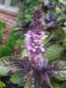I usually keep the basil from blooming by trimming of the tips but this one got away from me. The pink of the flowers is exceptionally pretty with the purple foliage.