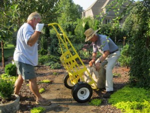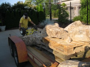Using a hand truck the headgardener and our landscaper moved the rocks into the general area where they would be placed.