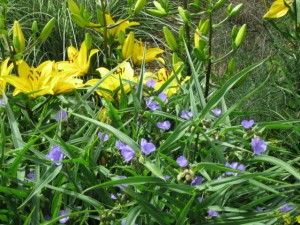 The daylilies are coming along well and ‘Happy Returns’ joined ‘Stella D’oro in bloom. The tradescantia growing behind it creates and pleasing yellow blue combination.