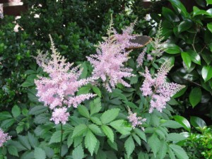 The shade under the dogwood tree in the secret garden is home to these lovely pink astilbes.