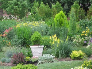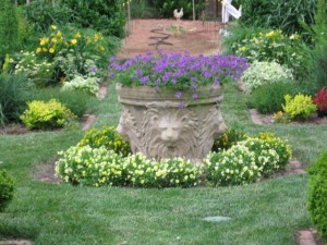 The last remaining yellow Johnny-jump-ups around the large container in the center of the formal garden are about to go and be replaced by annual ageratum to complement the blue verbena “Homestead purple’ in the container.