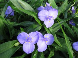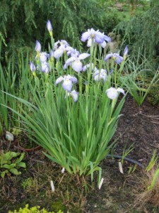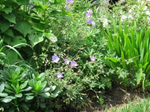 Another blue flower, the geranium ‘Johnson Blue’, forms a large spray over nearby plants. It only blooms for a few weeks in the spring but picks up the blue of the tradescantia that bloom elsewhere.