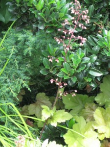 Heuchera ‘Dolce Peach Melba’ is also blooming there. I grow the heuchera for the foliage but I like the stems of flowers it produces and pick them for pressing in my numerous phone books.