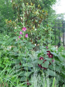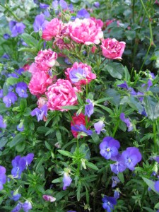 Elsewhere in the formal garden blue Johnny jump ups are also on their last legs but are so pretty with the bright pink rose in which they bloom that I can’t bear to pull them up. The rose supports them on their weak legs so their floppiness is tolerable; besides, they will be replaced by the rose as it grows larger during the summer so pulling them out can be put off a little longer.
