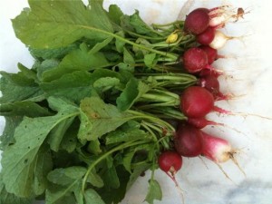 The vegetable garden has yielded its first crop, three bunches of radishes like this one.