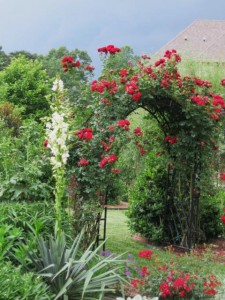 The yuccas have sent up their giant stalks and are beginning to bloom. Here it stands like a centennial near the rose ‘Olive’ that climbs over the arbor leading to the pool garden.