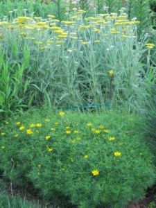 The yellow flowered creopsis ‘Zagreb’ grows at the feet of the yarrow “Cornation Gold’ complementing the golden golden color of the yarrow.