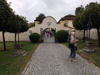 A cobblestone walkway takes visitors through a gate into the courtyard.