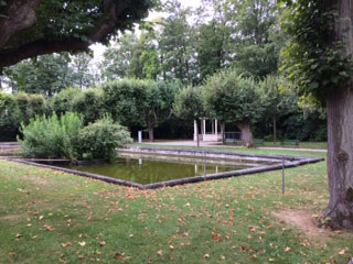 A rose garden flanks the pavilion with some familiar favorites; ‘Wife of Bath’,’ Fair Bianca’, ‘Warwick Castle’, and ‘Othello’.