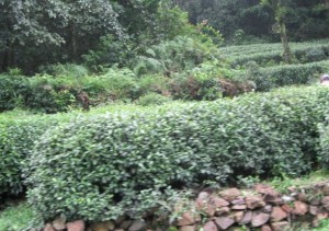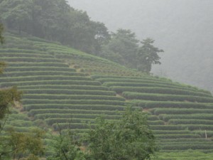 The quality of Dragon Well tea depends in part on the time the leaves are picked. The best quality tea is produced from the leaves picked in spring, before the Quingming Festival (about April 4th). The tea leaves picked a bit later in the spring but before the Grain Rain (about April 20th) are fairly good but are of second quality. The picture below was taken in late September (I wonder about the quality of the leaves that were picked then.)