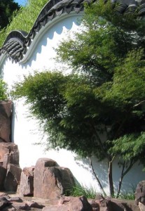 If you visit a classical Chinese garden, don’t expect to see a symmetrical layout, extensive areas of lawn, long vistas and panoramic views, avenues of trees or shrubs, flowers gathered in beds, or water flowing from elaborate fountains. Do expect to see the four elements, water, stone, plants, and architecture, arranged asymmetrically along a winding path so that the landscape is revealed a little bit at a time as if it was painted on a horizontal Chinese scroll.