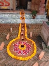 Rangoli can be made of a variety of materials including colored rice, flour, or sand, or even flower petals. The designs can be simple geometric shapes, or represent plants, animals, humans or gods. The lotus flower and its leaves, mango, peacocks, swans, parrots and fish are popular motifs but patterns vary depending on the local traditions. The size of the rangoli can vary from small to very large. When flower petals are used, daily maintenance of the design is necessary to keep the work looking fresh and appealing.