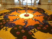 If you are lucky enough to visit India in the fall you might find a abundance of beautiful folk art designs in front of doorways and in the lobby of hotels in honor of Diwali, a five day Hindu festival also called the ‘festival of lights”. The brightly colored designs are traditionally created by Indian women in front of their doorways or gates to welcome the Hindu deities during religious holidays and special occasions. The rangoli, as they are known, have become very popular in hotels and other public places for their vivid colors and lively designs.