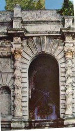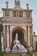 The Owl fountain near by is a spectacular achievement; a water driven device causes a bronze owl to appear at intervals emitting a screech that silences the twittering birds created by other hydraulic machinations. This is really amazing! But it was copied from an ancient Greek treatise by Hero of Alexandria!! This fountain originally had 8 niches each with a water jet and trick water jets in the pavement to surprise visitors.