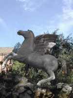 Above the Ovato Fountain is a fountain featuring Pegasus, the mythical winged horse borne from the blood of Medusa and used by Belerophon to conquer the Chimera. He stands here ready to take off to Mt. Parnassus home of the Muses, his head turned toward the villa.