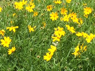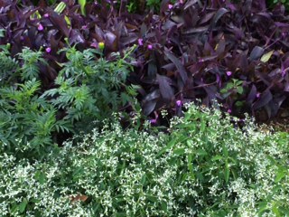 Euphorbia ‘Diamond Frost’, wandering jew, and yellow marigolds are teamed together.