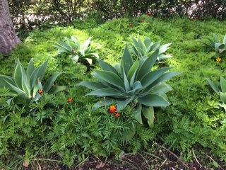 The fine textured leaves of the marigold contrast with thick succulent leaves of the agave while the the marigold’s flowers make a striking combination with the blue-green color color of the agave leaves and brighten the duo.