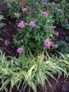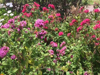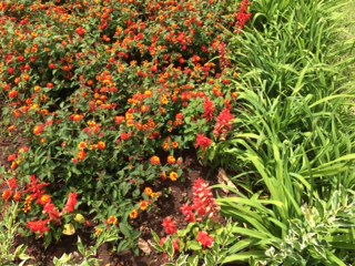 Plants were artfully located to produce beautiful and interesting combinations.Here salvia echoes the red in the flowers of the lantana while the abundant bright green leaves of the daylilies intensify their red color.