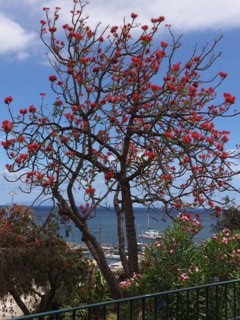 The flowers of a flame coral tree are set off against the blue shy and clouds.