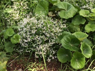 The large shiny coarse leaves of bergenia contrast with the delicate flowers of Euphorbia hypericifera ‘Diamond Frost’