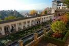 As soon as you enter the Generalife through the iron gates you know that this is a special place. Tall cypresses line the walkway, giving way to masses of oleander, rhoodendron, and roses. The highlight of the garden is the Patio de la Acequia with its breath-taking water display. A myriad of fountains spray water along the length of a long rectangular pond surrounded by plantings of both shrubs and flowering plants including myrtle, roses, and orange trees. This garden is bordered on two sides by porticoed pavilions, and a gallery of 18 arches on a third side. One of the porticoes called the mirador (lookout) has five beautiful arches with exquisite overhead windows. Passing through this portico you enter the Patio de la Sultana with its center pool surrounded by oleander and myrtle. Other outstanding features include a staircase with its flowing water in the banister that leads to the upper level of gardens. Parterres around a fountain containing roses create a more modern, renaissance look.