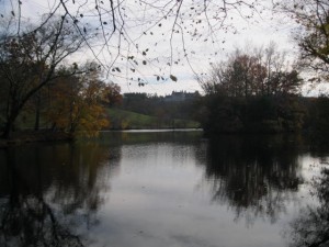 Near the mansion the Italian Garden with its three formal water gardens and classical statuary was set off by trees in fall foliage.