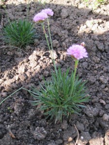 Sea pinks bear their clusters of pink flowers above tufts of grass like foliage.