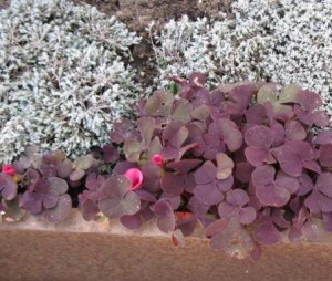 The deep purple leaves of oxalis complement the bright pink flowers;