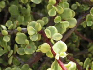 The thick fleshy leaves of variegated jade plant are often tinged with pink and complement the white flowers that appear in February.