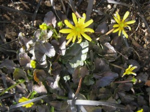 The deep bronze-green leaves of lesser celandine contrast with the bright yellow flowers.
