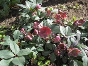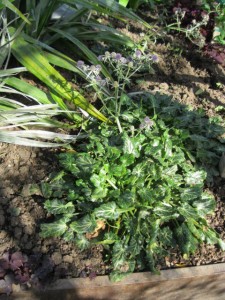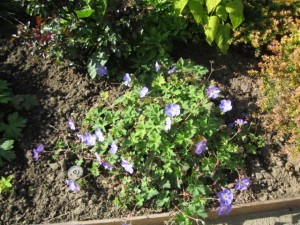 Lots of herbaceous perennials and herbs are blooming. Here we see crainsbill and lobelia ‘Crystal Palace’ in the background.