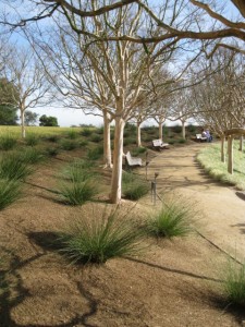 A visit to the Getty Center garden is always fun but is especially nice in March because the weather is cool and the garden is beginning to awaken. Many plants are blooming while others boast beautiful stems and foliage. The deciduous trees and shrubs have not leafed out yet so their skeletons add texture and interest to the whole scheme while allowing you to enjoy views of the garden that disappear with the appearance of leaves.