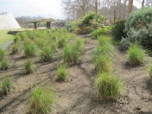 London plane trees ‘Yarwood’ line each side of the stream going from the top of the garden to the center. Swaths of deergrass adorns the upper banks of the garden.