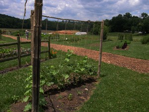 After a visit to the house, you can enjoy the farm area where there is a farmyard and gardens. These cucumbers are going to be trained up teepees.