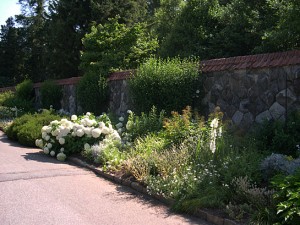 Bountiful borders of flowers fill the borders on three sides. Here the white border overflows its boundaries with its luxuriant growth.