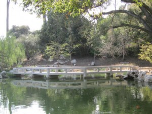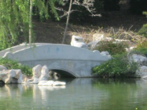 The Bridge of the Joy of Fish leads from the lake edge to the Mandarin Ducks Island.