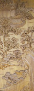 Eight carved wood panels of Suzhou gardens decorate the inside of the Love for the Lotus Pavilion.