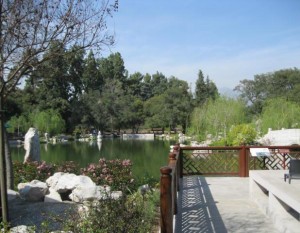 Outside the Hall of the Jade Camellia, the Terrace that Invites the Mountain gives you an view of the lake with the San Gabriel Mountains in the background (only slightly visible in the mist.) Borrowing distant scenery is common in the gardens of China.