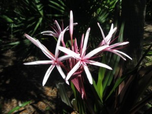 Ferns, grasses, groundcovers, bromeliads, and other exotic plants form a lush under story. This exquisite lily brightens the scene with its color and shape.