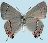 The gray hairstreak is one of the most widely distributed butterflies in the US being absent only from the far North. They prefer open sunny sights such as coastal areas, chaparral, old fields, parks, vacant lots, and roadsides. The dorsal side is deep slate gray with an orange spot on the hindwing near the tail. The ventral side is dove-gray with a straight, thin straight white mid-band is bordered by orange on the inside edge. Heads usually have an orange patch and the abdomens of males often have orange sides. The wingspan is 7/8 to 1 3/8 inches.