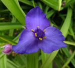 With its arching foliage this easy to grow herbaceous perennial might grab your attention for resembling a squatting spider but if not, the very long bloom time will please. The plants grow in clumps produce terminal clusters of blue or purplish flowers from spring into summer for an 8 week bloom time. Each flower is 2″ across and has three petals and showy yellow stamens. Plants may hybridize with other species and so color flower may be pink, or white in addition to various shades of blue and purple. The narrow, arching, bright green leaves are up to 1′ long and are attractive until mid summer when they can be cut back to encourage rebloom.